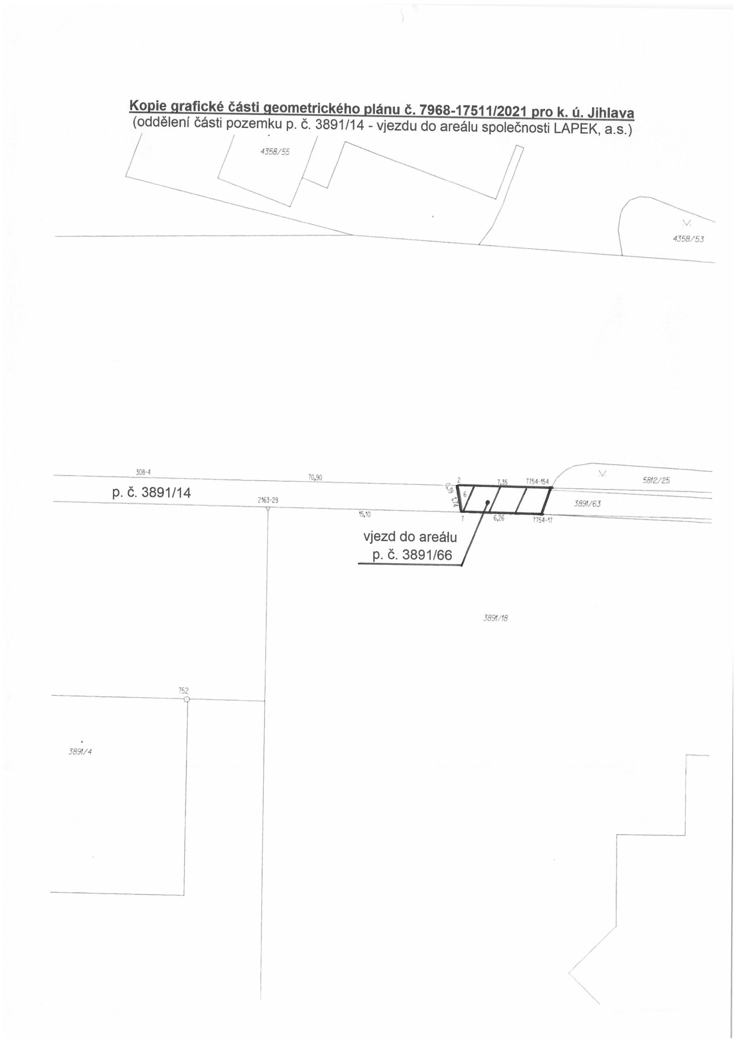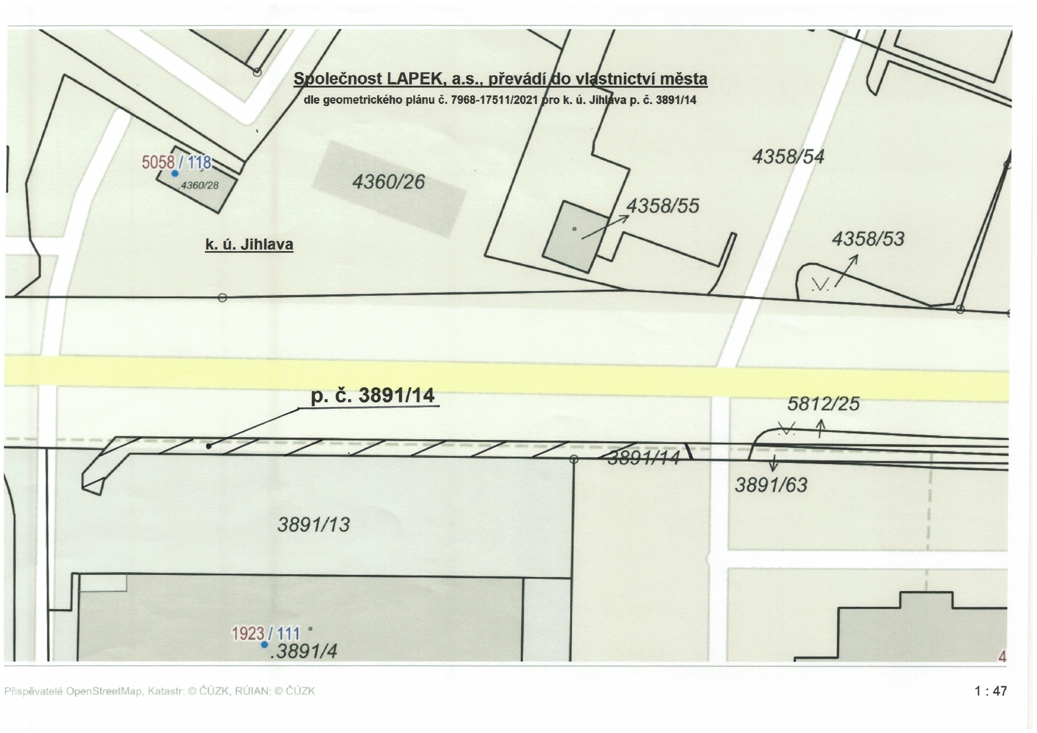 směnu části pozemku v k. ú. Jihlava p. č. 3891/14 dle geometrického plánu č. 7968-17511/2021 pro k. ú. Jihlava označené jako nově utvořený pozemek p. č. 3891/14 a pozemků v k. ú. Jihlava p. č. 3891/63, p. č. 3891/64 a p. č. 3891/65 ve vlastnictví společnosti LAPEK, a. s., se sídlem Žižkova 1923/111, Jihlava, IČO 440 15 593, za části pozemků v k. ú. Jihlava p. č. 3891/1 a p. č. 3892/1 uvedeným geometrickým plánem sloučených a označených jako nově utvořený pozemek p. č. 3892/52 ve vlastnictví statutárního města Jihlavy s finančním vyrovnáním ve výši 267.175 Kč ve prospěch společnosti LAPEK, a. s., dle důvodové zprávy za podmínek: