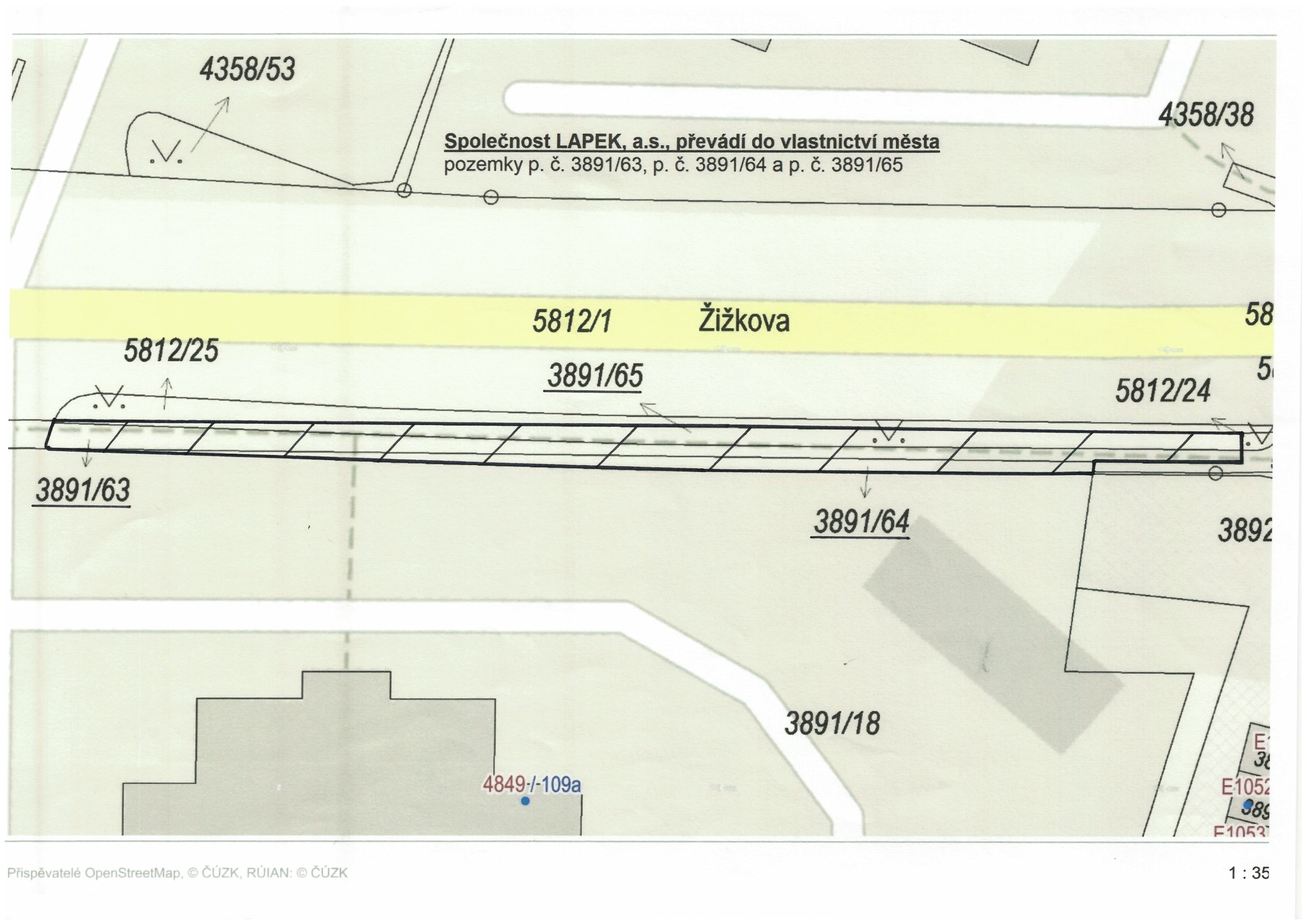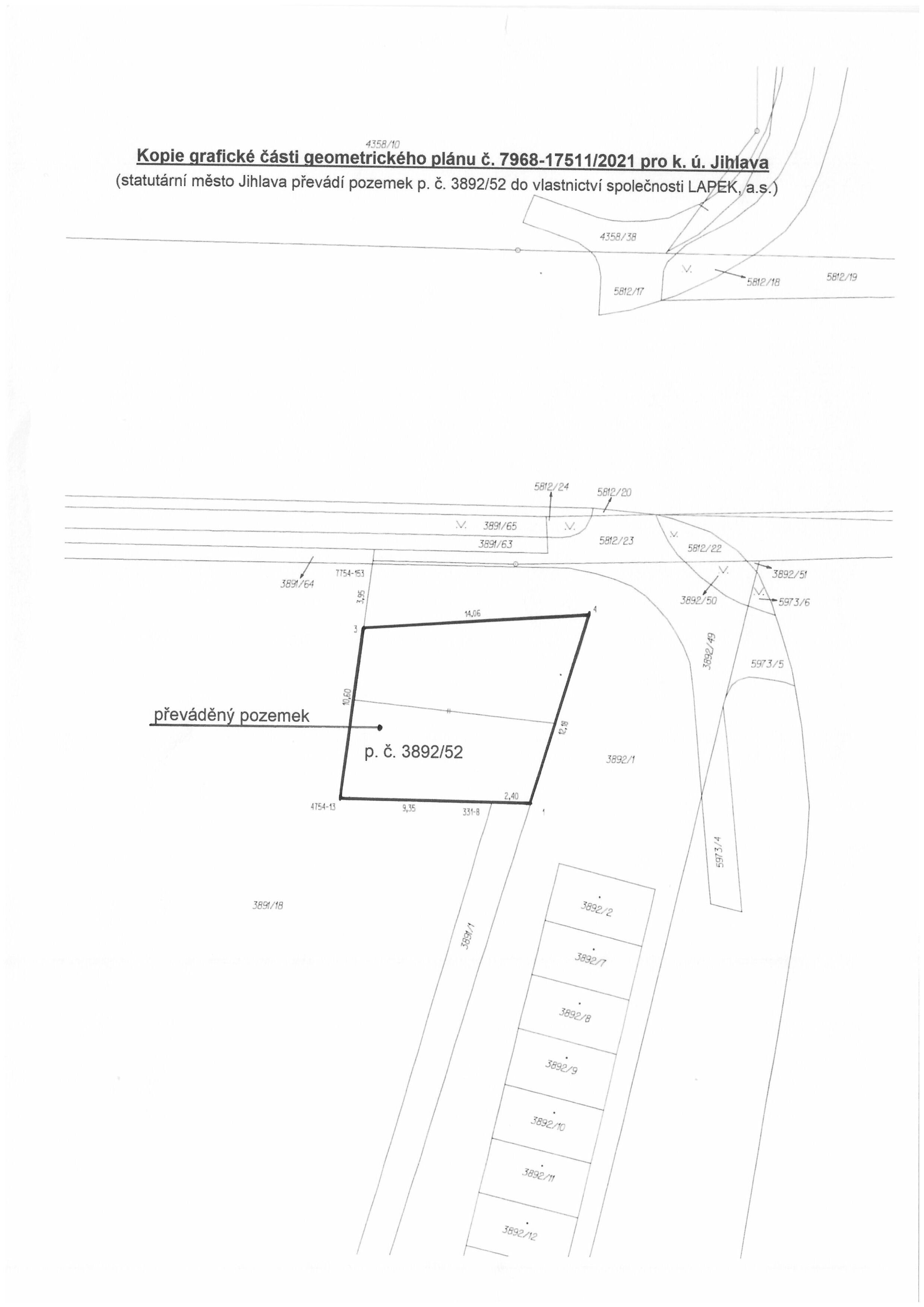Dle vypracovaných geometrických plánů, na základě výše uvedeného a vydaného kolaudačního souhlasu na Stavbu, proběhne směna pozemků takto: p. č. 3892/52 o výměře 141 m2 ve vlastnictví statutárního města Jihlavy za p. č. 3891/14, ostatní plocha, ostatní komunikace, o výměře 162 m2, p. č. 3891/63, ostatní plocha, ostatní komunikace, o výměře 98 m2, p. č. 3891/64, ostatní plocha, ostatní komunikace, o výměře 55 m2, a p. č. 3891/65, zeleň, o výměře 86 m2 ve vlastnictví společnosti LAPEK, a.s.