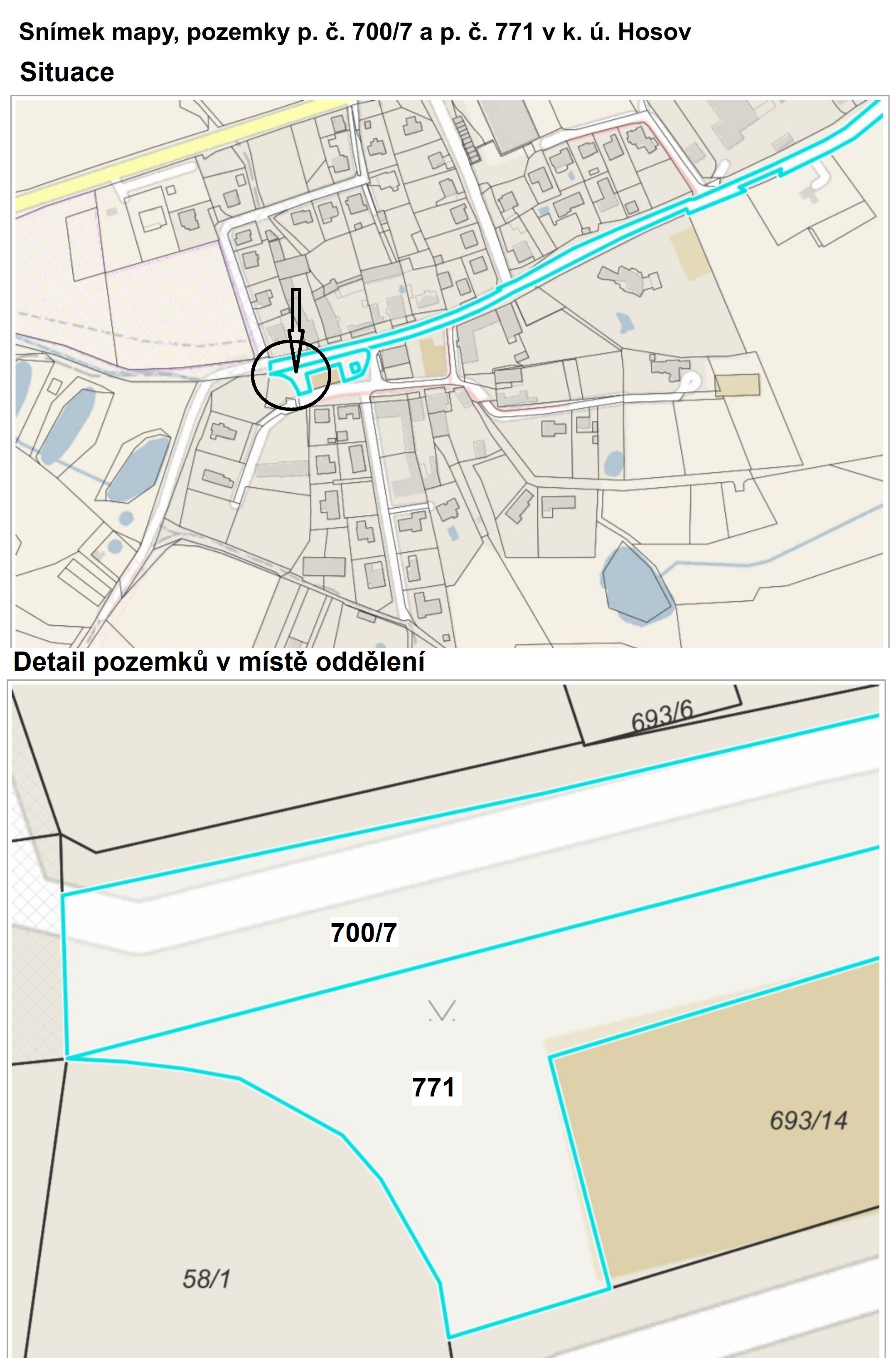 Popis problému: Předmětné části pozemků se nachází v lokalitě obce Hosov, u místní komunikace poblíž hřiště a budou kupujícím využity za účelem vybudování kioskové trafostanice. V rámci úvodní žádosti žadatele podané v roce 2017 bylo postupně několikrát v orgánech města projednáváno různé umístění kioskové trafostanice v dané obci a nebylo možné najít shodu dotčených odborů k navrženým variantám umístění. Konečné umístění trafostanice vychází z jednání majetkové komise ze dne 12.03.2019, která doporučila variantu č. 3, tj umístění trafostanice pod plochou hřiště u komunikace. K umístění trafostanice ve variantě č. 3 nebylo stanovisko Útvaru městského architekta (v době projednání se vyjádřil stávající úřad územního plánování) a to bylo následně majetkovým odborem dožádáno. Dotčené odbory (odbor životního prostředí a odbor dopravy) požadovali účast při venkovním geometrickém zaměření. Stanoviska dotčených odborů a doporučení orgánu města, uvedené v tomto návrhu, se týkají již konečné varianty umístění trafostanice. V roce 2021 žadatel obnovil svůj požadavek realizovat převod částí pozemků. Na základě toho bylo majetkovým odborem svoláno společné jednání na místě samém za účelem definitivního přesného stanovení bodů v terénu k oddělení částí pozemků v místě doporučeného umístění trafostanice. Společného jednání se zúčastnil zástupce žadatele, majetkového odboru a odboru životního prostředí (OŽP). Zástupce OŽP schválil dohodnuté umístění trafostanice přímo v terénu. Zástupce odboru dopravy se nemohl zúčastnit a byl obeznámen s konečným návrhem oddělení pozemků s tím, že ve svém závěrečném vyjádření připustil dohodnuté stanovení oddělovacích bodů za podmínky, že převáděný pozemek nebude oplocen a bude umožněn vstup na část převáděného pozemku před vlastní stavbou trafostanice (pruh 50 cm ve směru ke komunikaci). Společnost EG.D trafostanice nikdy neoplocuje, takže nebyl třeba v kupní smlouvě v tomto směru sjednávat žádný závazek. Majetková komise dne 22.06.2021 doporučila prodej předmětných částí pozemků společnosti EG.D za kupní cenu 3 000 Kč/m2 (viz. oddíl "Stanoviska komise RM / výboru ZM:"). Převáděné části pozemků dle tohoto návrhu jsou stavebním pozemkem pro účely zákona č. 235/2004 Sb., o DPH, v platném znění a kupní cena bude zatížena daní z přidané hodnoty v základní sazbě. Záměr prodeje částí pozemků dle předloženého záměru byl zveřejněn v souladu se zákonem o obcích č. 128/2000 Sb., v platném znění od 09.05.2022 do 25.05.2022 pod UID jihlvp22v00wg1.