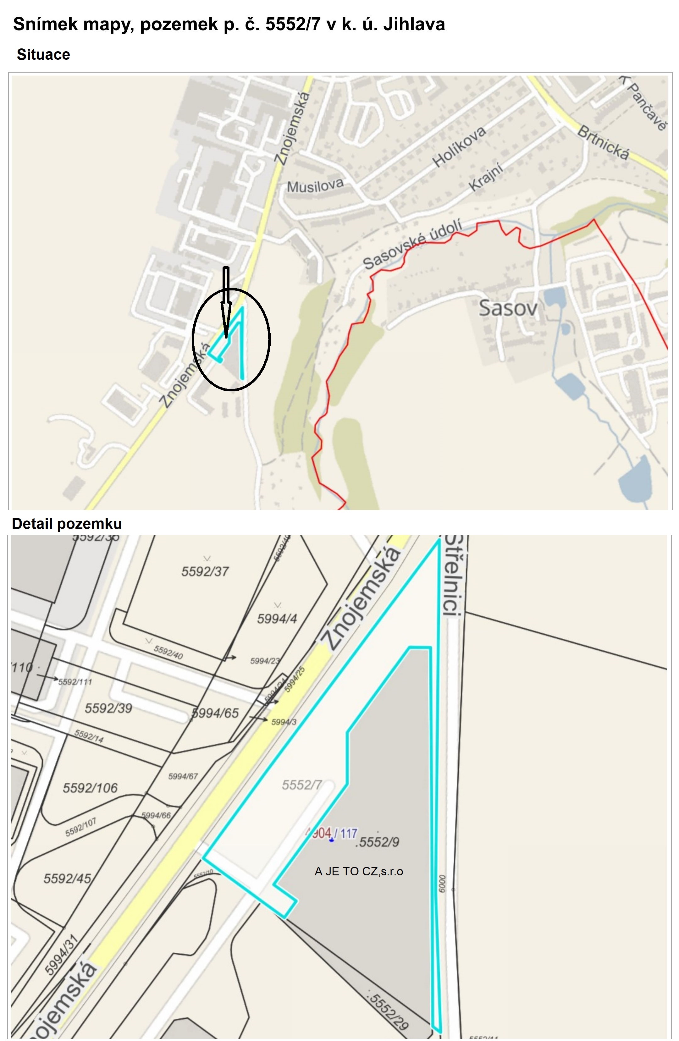 Tento návrh se týká schválení smlouvy o budoucí smlouvě darovací dle přílohy č. 1, ve které se společnost A JE TO CZ,s.r.o., se sídlem Řípov 41, 674 01 Třebíč, IČO 26246007 (dále jen společnost A JE TO) zavazuje bezúplatně převést formou darování na statutární město Jihlava část pozemku p. č. 5552/7 v k. ú. Jihlava v rozsahu cca 202 m2. Uvedená část pozemku se nachází při ul. Znojemská v Jihlavě a bude dotčena stavbou chodníku, jehož investorem je statutární město Jihlava. Po stavbě chodníku dojde k zaměření stavby a oddělení potřebné části pozemku p. č. 5552/7 a uzavření vlastní darovací smlouvy.